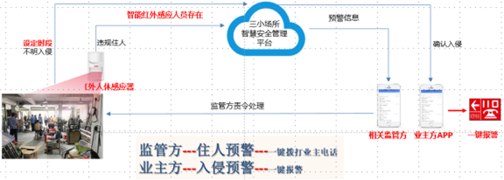 紅外人體存在感應(yīng)器在設(shè)定的時間內(nèi)(可自由設(shè)置)實時感知三小場所夜間人員滯留情況,當(dāng)探測到人員存在時,立即預(yù)警,推送報警信息至相關(guān)監(jiān)管方/業(yè)主方APP上。